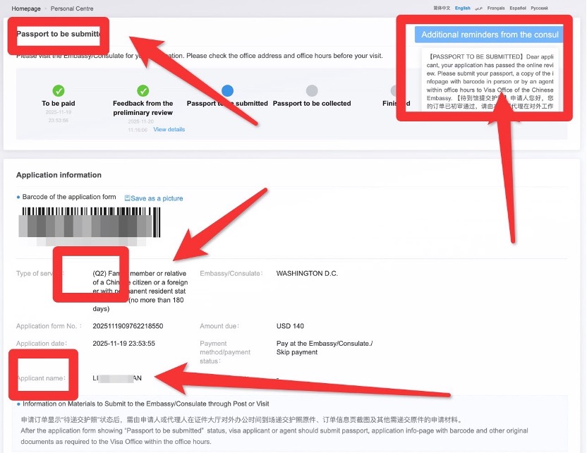 3b. For former Chinese nationals applying for a Chinese visa for the first time, submit the original last Chinese passport (the Embassy will cancel it by corner-cutting), and one photocopy of the Chinese passport information page. - A printed screenshot of the application infopage with the barcode that has passed the Embassy’s preliminary review.